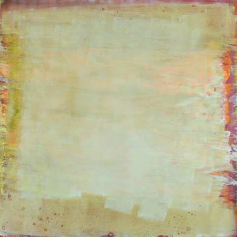 In some of her pictures – such as Ohne Titel (Untitled, 2013 ) a remarkable number of diverse colours appear in these zones. The centre of this picture (in quadratic format) is dominated by a light yellow and beige-coloured layer of overpainting, but the edges of the picture, to either side, exhibit brilliant orange alongside deep purple, brown, yellow, beige and other colours. One might almost think that the attractive features of the painting had shifted out to its edges. Closer inspection, however, shows the central part of the picture to be no less eventful; as one looks, more and more of the horizontal flow of streaks of colour are seen beneath the lighter shades. At the sides, the streaks of colour are seen openly: but in the centre, they appear as if submerged, tied into a fluid continuum that can be perceived in a ‘delayed’ way.