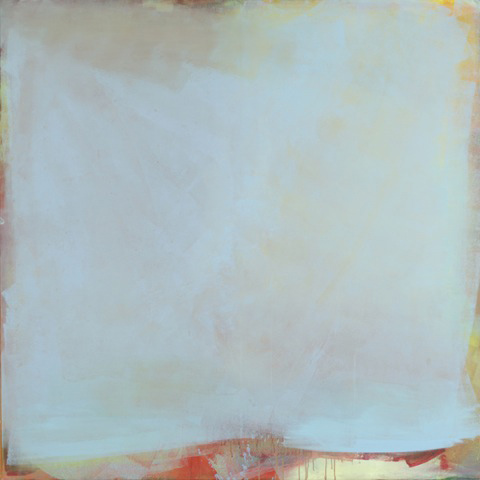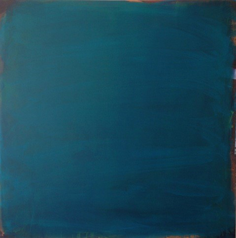 The second statement is true of another picture painted in 2013, more than two-thirds of which is covered with a light blue surface form. In the upper part of the picture, this light blue appears diffuse – in places, it appears to be on the point of dissolving – but this surface ends with a largely clear, gently curving edge in parallel with the picture’s lower edge. In contrast to the relatively wavering spatial parameters above, the lower half of the picture shows a high degree of differentiation. Without aiming to give the impression of representationality, the picture, in this case, tends towards a graspable quality that approaches the representational. This applies firstly to the expanse of blue itself, which curves and appears to float against a multicoloured background. Going further, one has the impression that this ‘paint curtain’ might lift, revealing to our gaze a scene that lies beyond it.