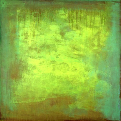 In a large-format painting from 2011, an enormous brilliance of colour appears kindled. In the centre of the picture, a light, almost poisonous-looking yellow-green body of light curves forward. It is as if this enormous presence were bursting through the cloudy smears of colour to either side, and through the glazes flowing down from above: this may relate to the title of the artwork: “Die Mitte eines Augenblicks” or (“The Centre of a Moment”).